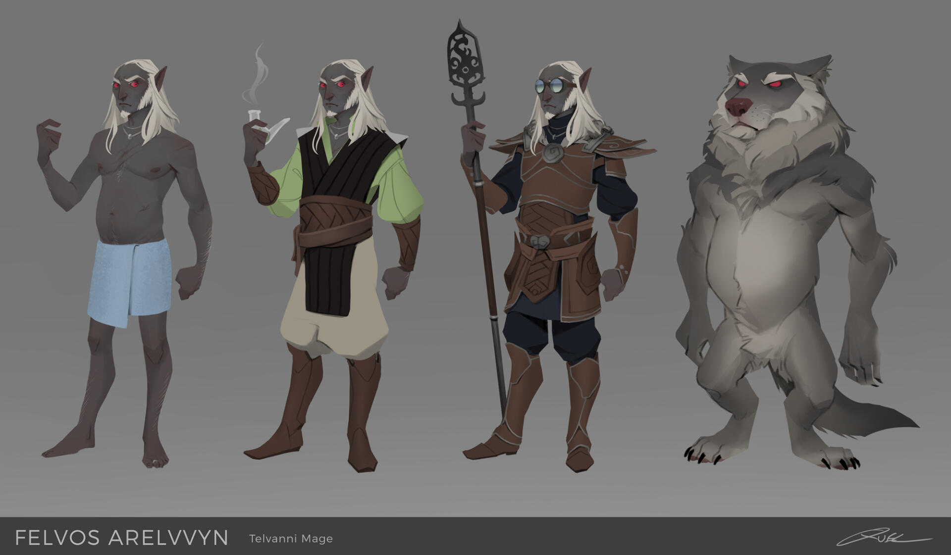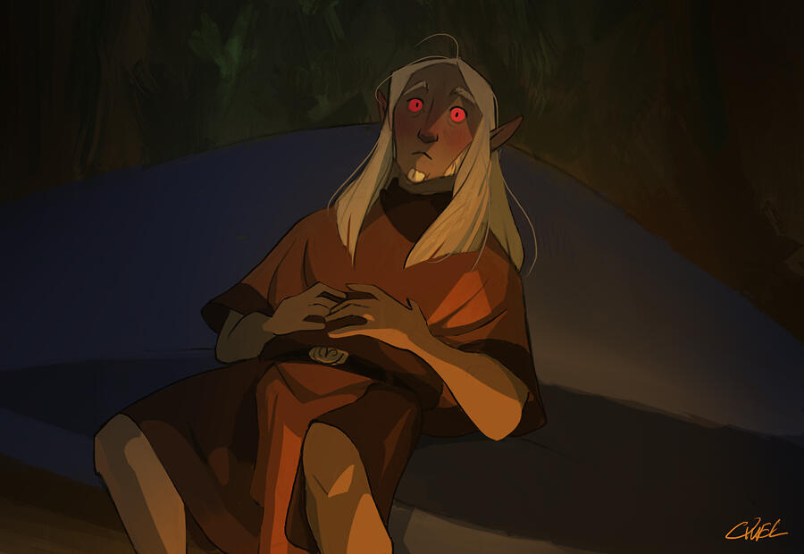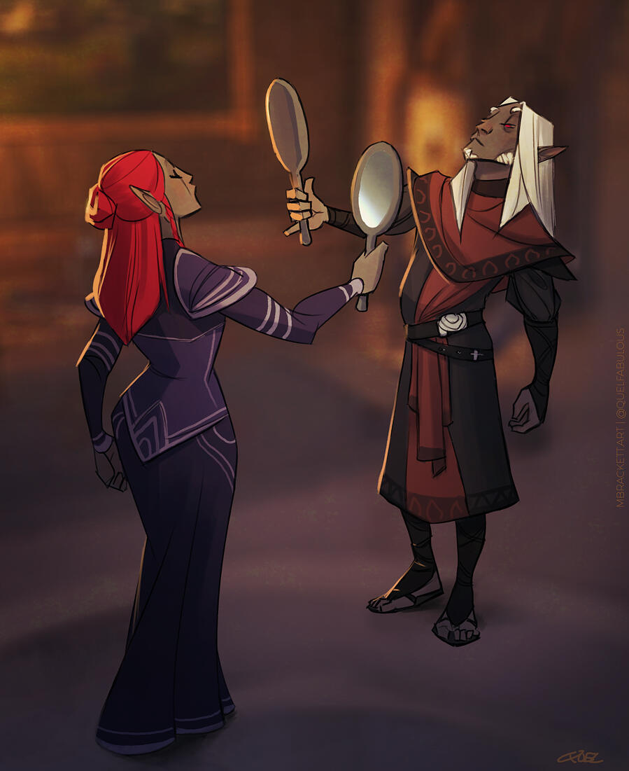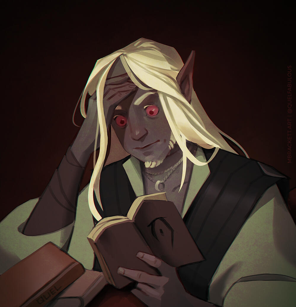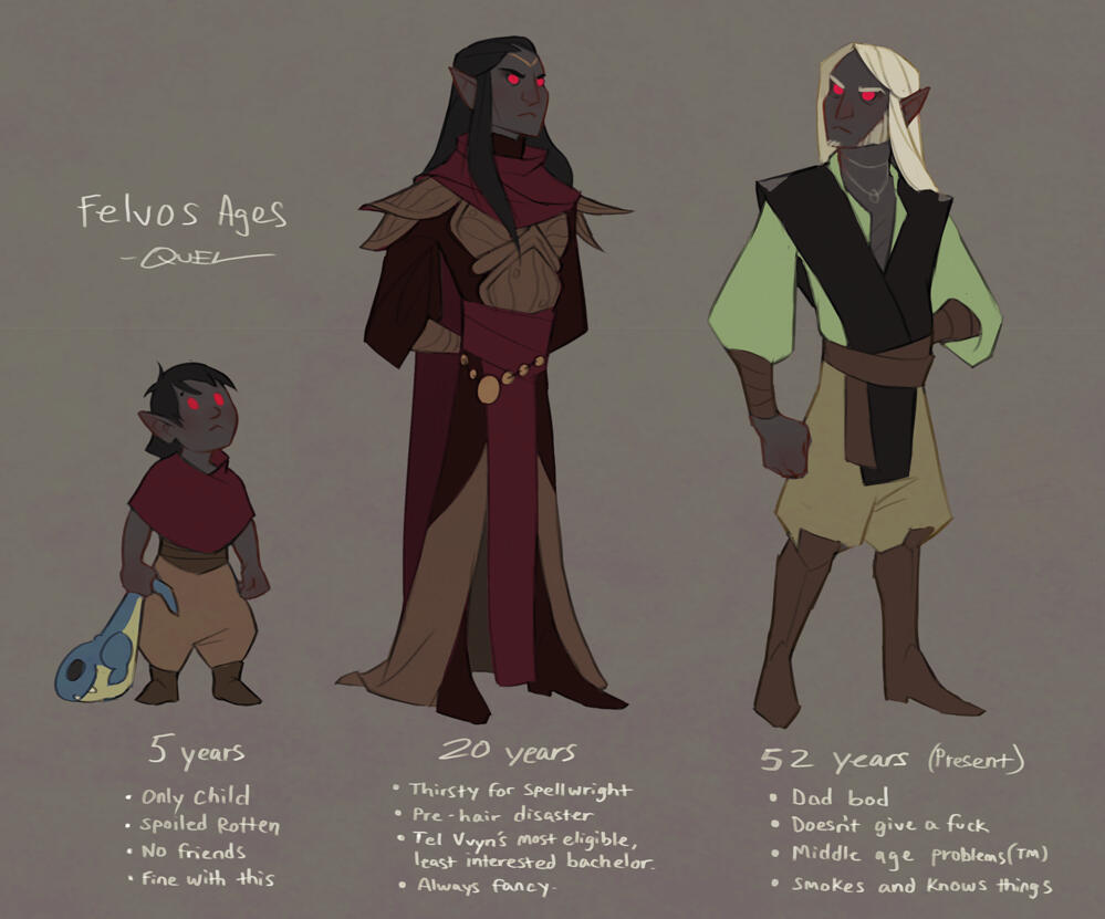 Felvos Vvyn was born to Wizard-Lord Velese Vvyn of House Telvanni in Sun’s Dusk, 16th, 2E 531. He was an only child of a wealthy and powerful red mountain mage family in the great House, and with it came large expectations to fill. His early years were spent studying under his mother's spellwrights and being groomed for his purpose of eventually leading Tel Vvyn. Like many of his lineage, Felvos was quite adept with the arcane and aged to become skilled in his own right with earthly mysticism and medicine. But with a growing conflict between Tel Vvyn & other neighboring establishments who abhored the family’s open condemnation of slavery, the Wizard-Lord’s plans for her son changed.Tel Vvyn needed to seal a powerful alliance with another wizard family, and thus, Felvos was forced to cease his climb just shy of spellwright and enter an arranged marriage. He was married shortly after his twenty ninth birthday to Qyss Arelno, the daughter of a wise mage from an allied Tel. While both of them had an awkward relationship at best, they sealed the alliance with a daughter, Ferdyn, two years later.Tensions between Tel Vvyn and neighboring Droerloth grew until they boiled over a year and a half later, and in a single night, the once proud home of the medicinal red mountain mages was reduced to only infrastructure. Wizard-Lord Vvyn, her mages, her kin, her oathmen and hirelings- murdered by a raid on the Tel, orchestrated by Wizard Balvus Droerloth. Felvos and his baby daughter were the only to escape. Felvos’s surname “Arelvvyn” is an alias, and a small memorial to Qyss, who had been killed in the incident.With the danger of his situation, Felvos reluctantly re-homed Ferdyn with a loving Hlaalu family to protect her knowing that Droerloth still hunted them. He took what money and notoriety he had to establish his own little apothecary just north east of the Redoran town of Gnisis, and seemed to accept life from then on out as a quiet hermit who should’ve been a dead man.In that twenty years, Felvos rebuilt a name for himself, found peace in his passionate medical work, met and married the true love of his life, and reunited with his daughter. Today, Felvos lives between Ald Velothi and Western Skyrim with his nord husband, Adrianos. He remains passionate about his homeland if only for his now adult daughter's sake, plotting his careful move to retake Tel Vvyn from the Wizard that murdered his family, by any means necessary.